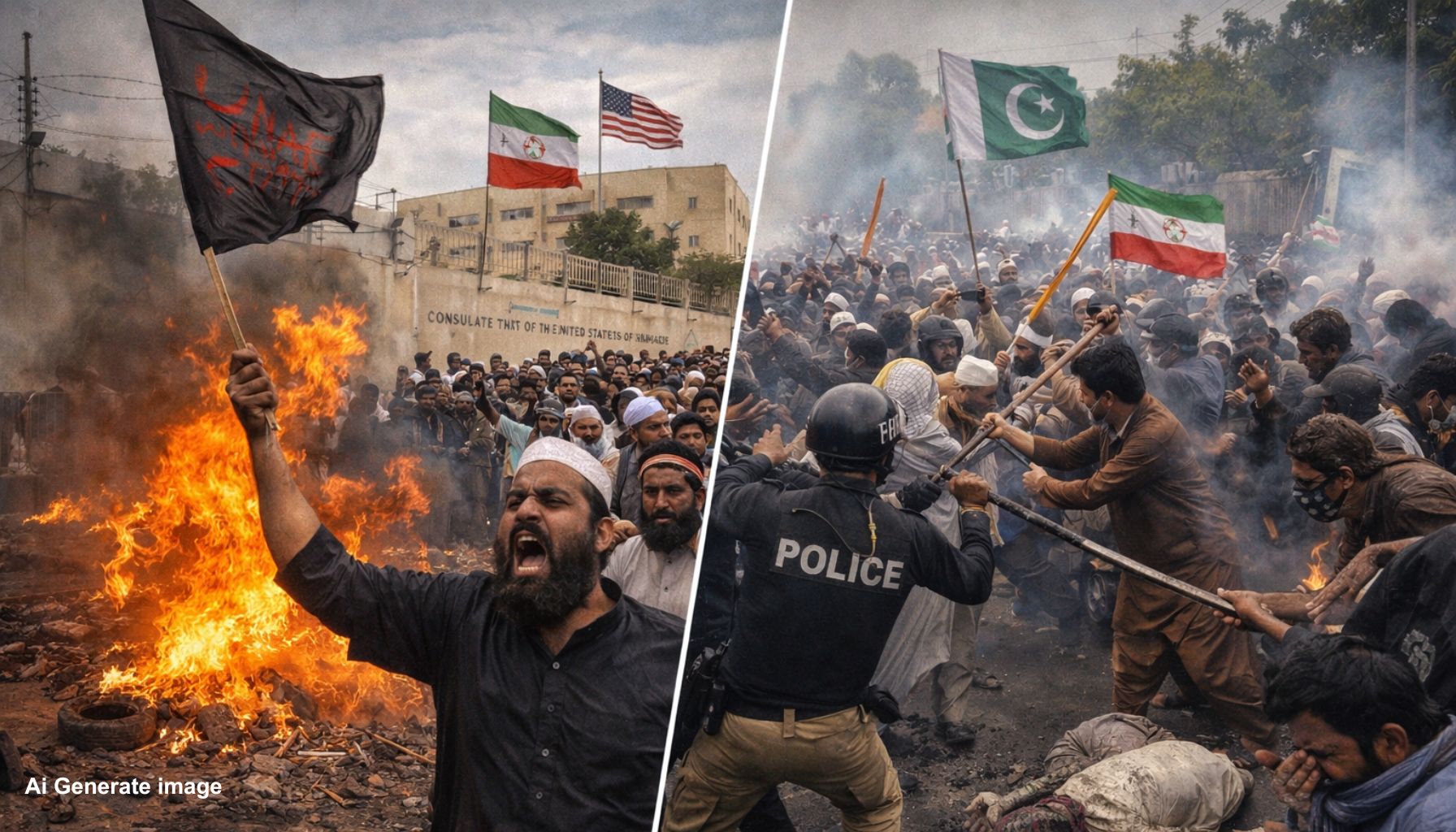 ईरान: के सर्वोच्च नेता Ayatollah Ali Khamenei की कथित हत्या के बाद पाकिस्तान में गुस्से की लहर तेज हो गई है। रविवार को Karachi में अमेरिकी वाणिज्य दूतावास के बाहर हिंसक प्रदर्शन भड़क उठे। माई कोलाची रोड स्थित United States Consulate General Karachi के पास हजारों प्रदर्शनकारी जमा हो गए और देखते ही देखते स्थिति बेकाबू हो गई।