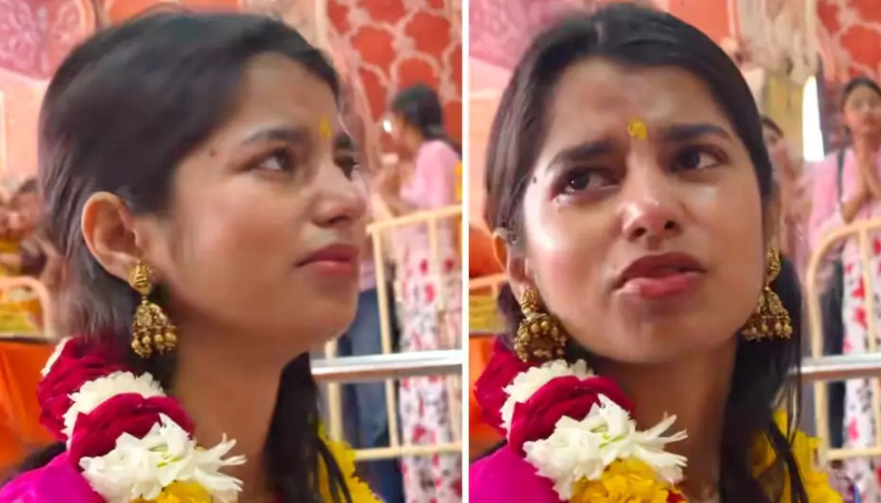 मंदिर में मौजूद श्रद्धालुओं के बीच मैथिली ठाकुर भजन गा रही थीं— “आज तो नवेली राधा गौरी पूजन आई छ…”। भजन के दौरान मंदिर में बजती घंटियों की ध्वनि, तालियों की गूंज और भक्तों की भक्ति ने ऐसा माहौल बना दिया कि वह भावुक हो गईं।