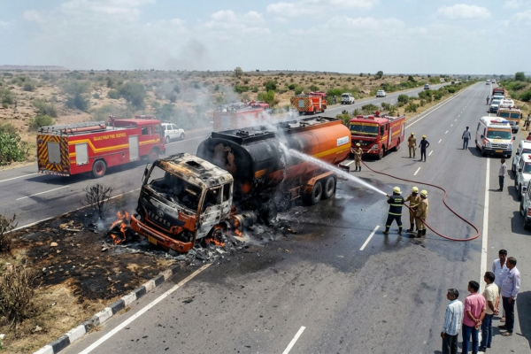 राजस्थान: के जालोर जिले में बुधवार दोपहर एक भयावह सड़क हादसा सामने आया, जब जैसलमेर-जामनगर नेशनल हाईवे (NH-68) पर एथेनॉल से भरा एक टैंकर पलट गया और कुछ ही पलों में आग का गोला बन गया। हादसा सांचौर क्षेत्र के सिंवाड़ा ओवरब्रिज के पास हुआ, जहां टैंकर के पलटते ही आग की लपटें करीब 200…